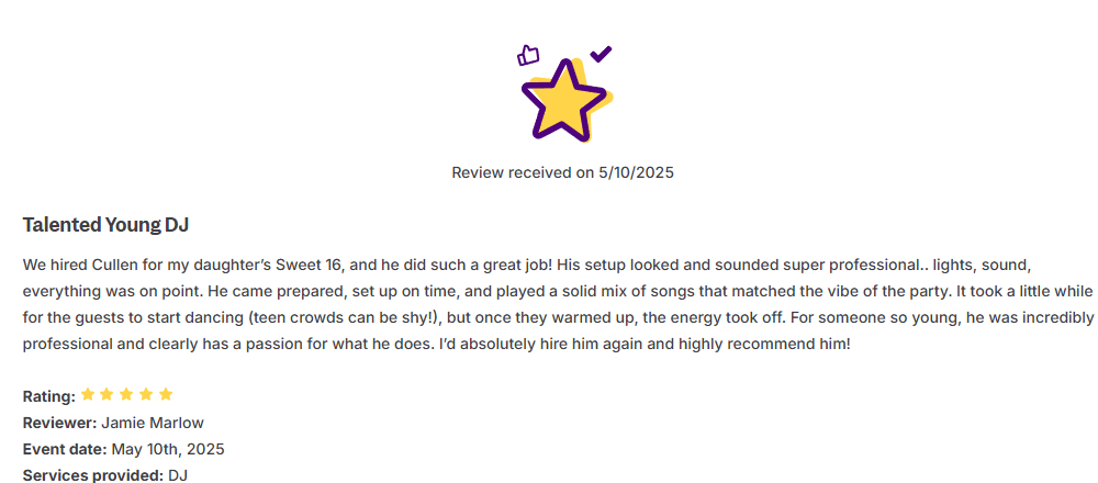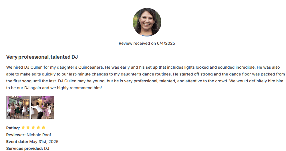 I will continue to recommend Cullen for any DJ opportunies that come up! He always does a great job at creating music for our events, whether it's for a dinner event, dance or party.